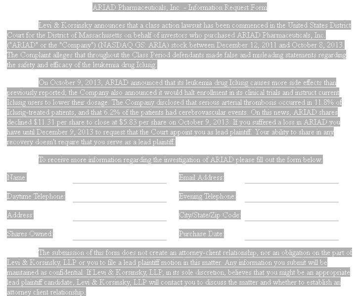 Am 9. Oktober 2013 bekannt gegeben , dass seine ARIAD Leukämie-Medikament Iclusig verursacht mehr Nebenwirkungen als zuvor berichtet , das Unternehmen auch angekündigt, es würde Einschreibung in seiner klinischen Studien zu stoppen und beauftragen aktuellen Iclusig Benutzern, ihre Dosierung senken. Das Unternehmen offenbart, dass schwere arterielle Thrombosen traten bei 11,8% der behandelten Patienten Iclusig und dass 6,2% der Patienten hatten zerebrovaskuläre Ereignisse . Auf dieser Nachrichten, ARIAD Aktie sank $ 11,31 pro Aktie auf 5,83 $ pro Aktie auf 9. Oktober 2013 zu schließen. Wenn Sie einen Verlust in ARIAD Sie litt bis 9. Dezember 2013 zu beantragen, dass das Gericht zu ernennen Sie als Hauptkläger . Ihre Fähigkeit, sich in einer Erholung Aktien nicht erforderlich, dass Sie als Hauptkläger zu dienen.