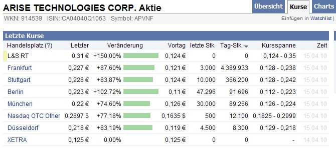 Die Aktie von Arise ist sowohl in Kanada als auch in Deutschland bei Zockern ausgesprochen beliebt. Und so lässt sich auch der gewaltige Kurssprung erklären. Nicht auszuschließen, dass die Aktie sogar noch weiter in die Höhe getrieben wird. DER AKTIONÄR rät allerdings von einer Beteiligung am kanadischen Solar-Feuerwerk ab, denn es könnte ebenso schnell wieder vorbei sein, wie es begonnen hat.