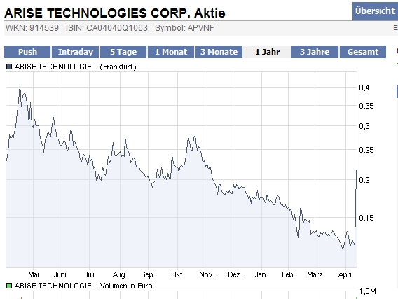 Arise hatte am Mittwochabend eine Prognose für das Ende März abgelaufene erste Quartal abgegeben. Der Umsatz soll gegenüber dem Vorjahr um 119 Prozent auf 15,8 Millionen Kanadische Dollar gesteigert werden. Das Unternehmen produziert seit mittlerweile zwei Jahren in Deutschland Solarzellen und wurde von der zwischenzeitlichen Solarkrise besonders hart getroffen. Insofern war die neue Prognose eine echte Überraschung.