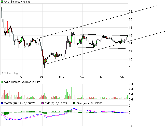 Mal sehen, ob der Kurs in Erwartung der Zahlen weiter nach oben getrieben wird und es dann vielleicht sogar bis zur 200-Tagelinie bei gut 18 geht, wo auch der langfristige Abwärtstrend ungefähr wartet. Sollte auch dieser Widerstand mal überwunden werden, könnte man von höherem träumen.