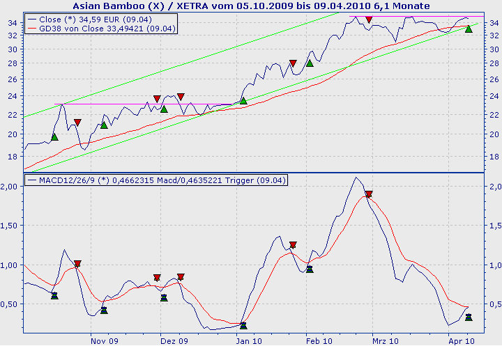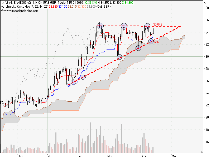 Die Aktie von Asian Bamboo hat ein sehr beeindruckendes Börsenjahr 2009 hinter sich. Von dem Tiefpunkt bei 4,70 Euro ging es bis zum Jahresende bis in den Bereich um 24,00 Euro. 2010 machte die Aktie da weiter, wo sie im Vorjahr aufgehört hatte. Der Nebenwert legte weiter zu und markierte schließlich ein Allzeithoch bei 35,66 Euro. Danach kam es zu einer überfälligen, wenngleich kurzen Konsolidierung. Das Papier drehte anschließend wieder nach oben, konnte die 35-Euro-Marke allerdings nicht zurückerobern. Anfang April arbeitet sich die Aktie nun wieder an die Widerstandsmarke heran.