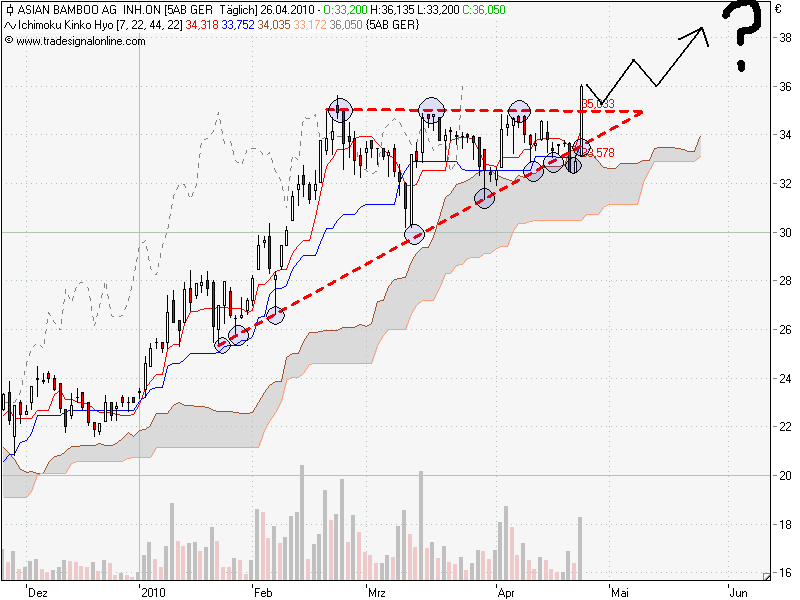 Die Aktie von Asian Bamboo hat ein sehr gutes Börsenjahr 2009 hinter sich. Vom Tiefpunkt bei 4,70 Euro ging es rasant bis in den Bereich von 24 Euro nach oben. Auch der Start in das Jahr 2010 ist geglückt. Der Kurs des chinesischen Bambusproduzenten markierte bei 35,66 Euro ein Allzeithoch. Seitdem befindet sich der Titel auf Konsolidierungskurs. Im laufenden Monat April arbeitet sich die Aktie jedoch wieder an die Widerstandsmarke um 36 Euro heran. Ein signifikanter Ausbruch über diesen Bereich würde ein Kaufsignal folgen lassen. Das nächste Kursziel liegt bei 40 Euro. Der Stoppkurs sollte bei 27 Euro platziert werden.