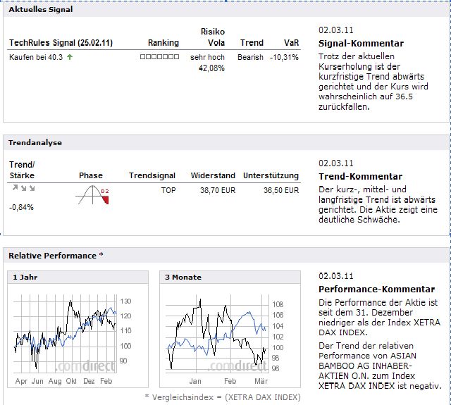 Für mich ist AB wegen des ziemlich sicheren weiteren Wachstums, das noch über mehrere Jahre anhalten wird, keine Tradingaktie, sondern eine Aktie, mit der man nach der alten Kostolany- Lehre umgehen sollte (kaufen, liegen lassen, nach ein paar Jahren nachschauen und angenehm überrascht sein). Schließlich soll es laut dem Vorstand von AB auch nicht bei 70.000 Ha enden, sondern es soll bis zu 150.000 Ha nach den neueren Plänen weitergehen. Nur leider weiß ich nicht wann das Wachstum sich dann in steigenden Kursen niederschlagen wird. Dies kann meiner Meinung nach jederzeit passieren. Wenn ich diesen Zeitpunkt wüsste, würde ich AB auch traden. Vielleicht geht es auch schon nach der Bekanntgabe der endgültigen Zahlen für 2010 nach oben, wenn AB etwas neues zum Ausblick vermelden sollte. Für mich ist AB eine der sichersten Wachstumsstorys , sofern es nicht zu Unruhen in China kommt. Das halte ich aber aufgrund der resoluten Regierung für nicht wahrscheinlich. Bambus kann für so viele Dinge verwendet werden und eigentlich auch Holz ziemlich ersetzen, was den Vorteil hat, dass Bambus wesentlich schneller wächst und geerntet werden kann. Irgendwann wird nicht nur China AB seinen Bambus abnehmen.
