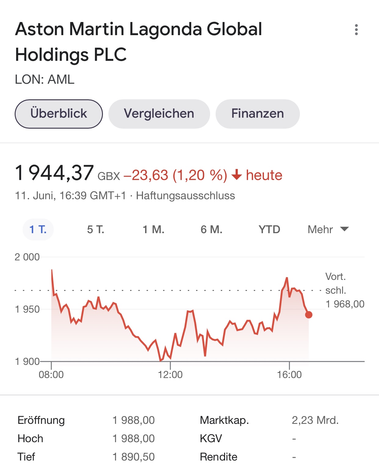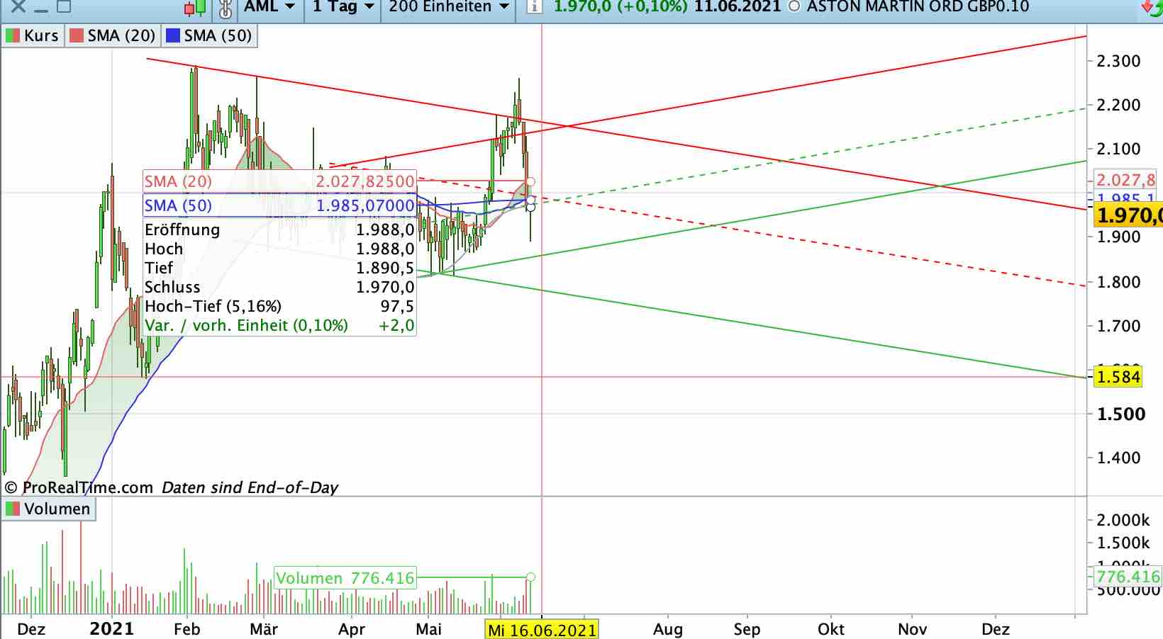 Immerhin - um etwas positives zum AML-Kurs zu schreiben: vom Tagestief sich sehr schön erholt. Und mit der Intraday-Erholung von AML hat auch mein Depot erstmals wieder ein Tagesplus am Schirm stehen. Alles steht und fällt bei mir leider mit AML und ausgerechnet diese Aktie ist so schwach im Kursverlauf, dass ich (noch) keinen Teilverkauf machen kann, um die Übergewichtung etwas zu reduzieren.