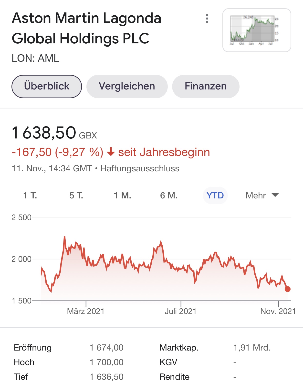 Vorige Woche 2000 Euro aufs Konto überwiesen, um die Margin zahlen zu können, und die Hälfte ist - trotz guter Börsen - schon weg wegen Aston Martin. Der Kurs ein Debakel, nicht mal die tollen Zahlen haben was daran ändern können.