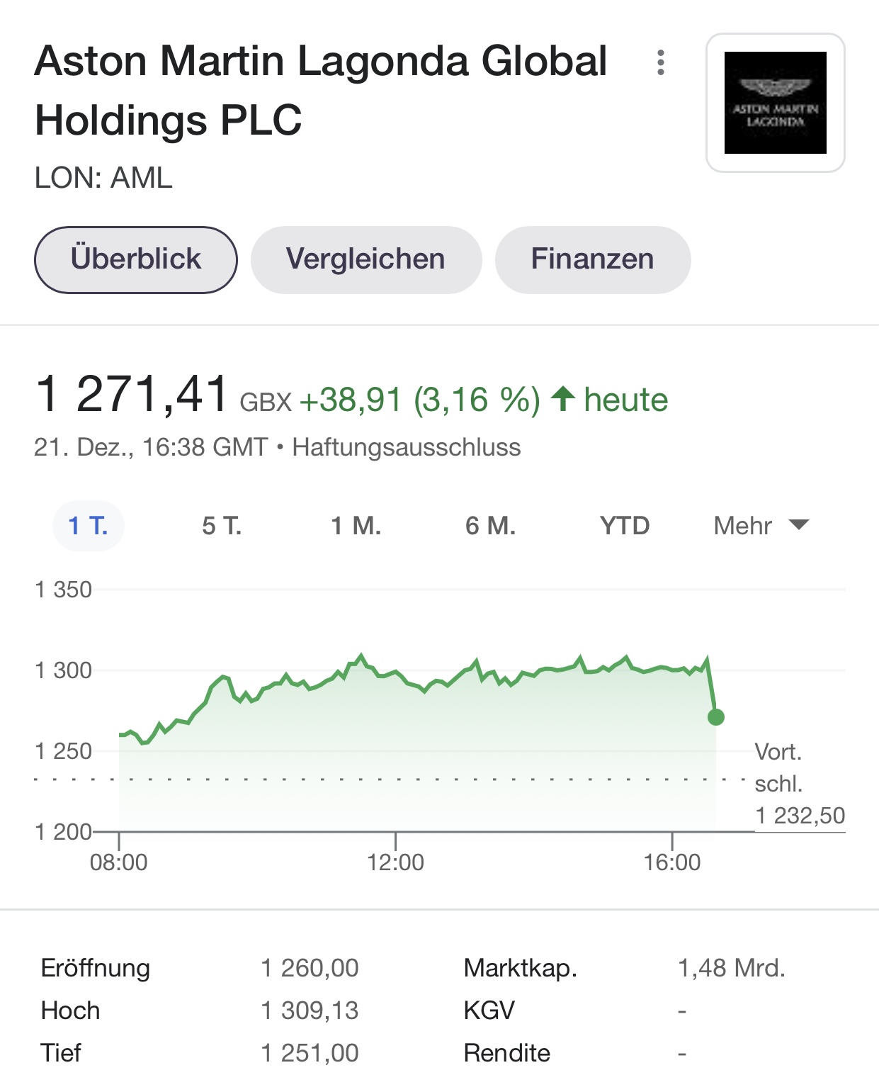 Man muss die Foristen insoweit verstehen, dass die meisten schon länger hier dabei sind (auch ich als Mitleser), und Aston Martin als turnaround Kandidaten identifiziert haben. Die Entwicklung war ja soweit auch sehr positiv, der Kurs lief von ca 0,50 (10,- nach resplit) bis hoch auf über 26,-.