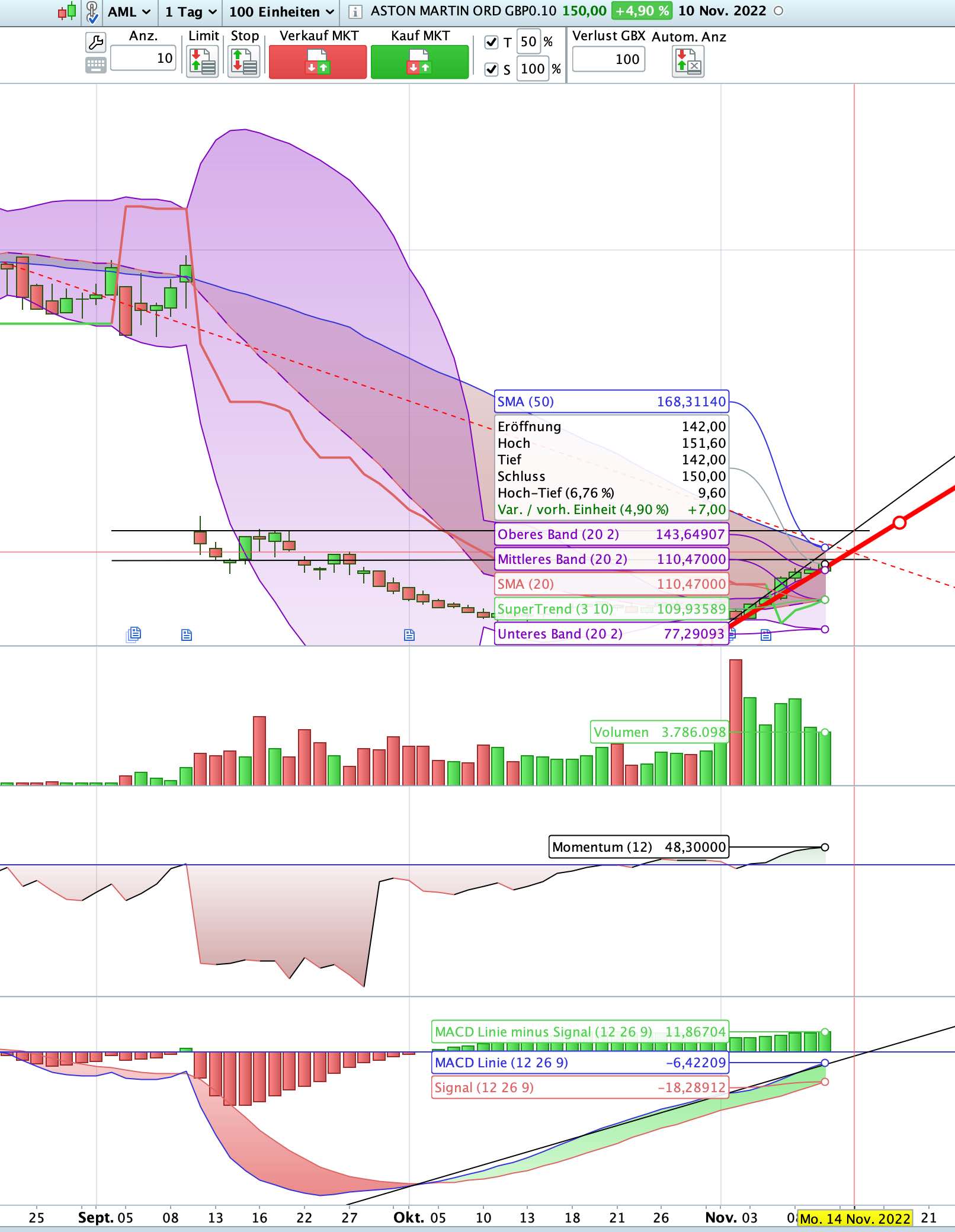 Das ist im ist kurzfristigen Bereich (nächste Woche) wahrscheinlich. Legt man dieses Signal mit dem MACD übereinander, wird das im Bereich 1,85 - 2,0 GBP passieren, wahrscheinlich am Freit..