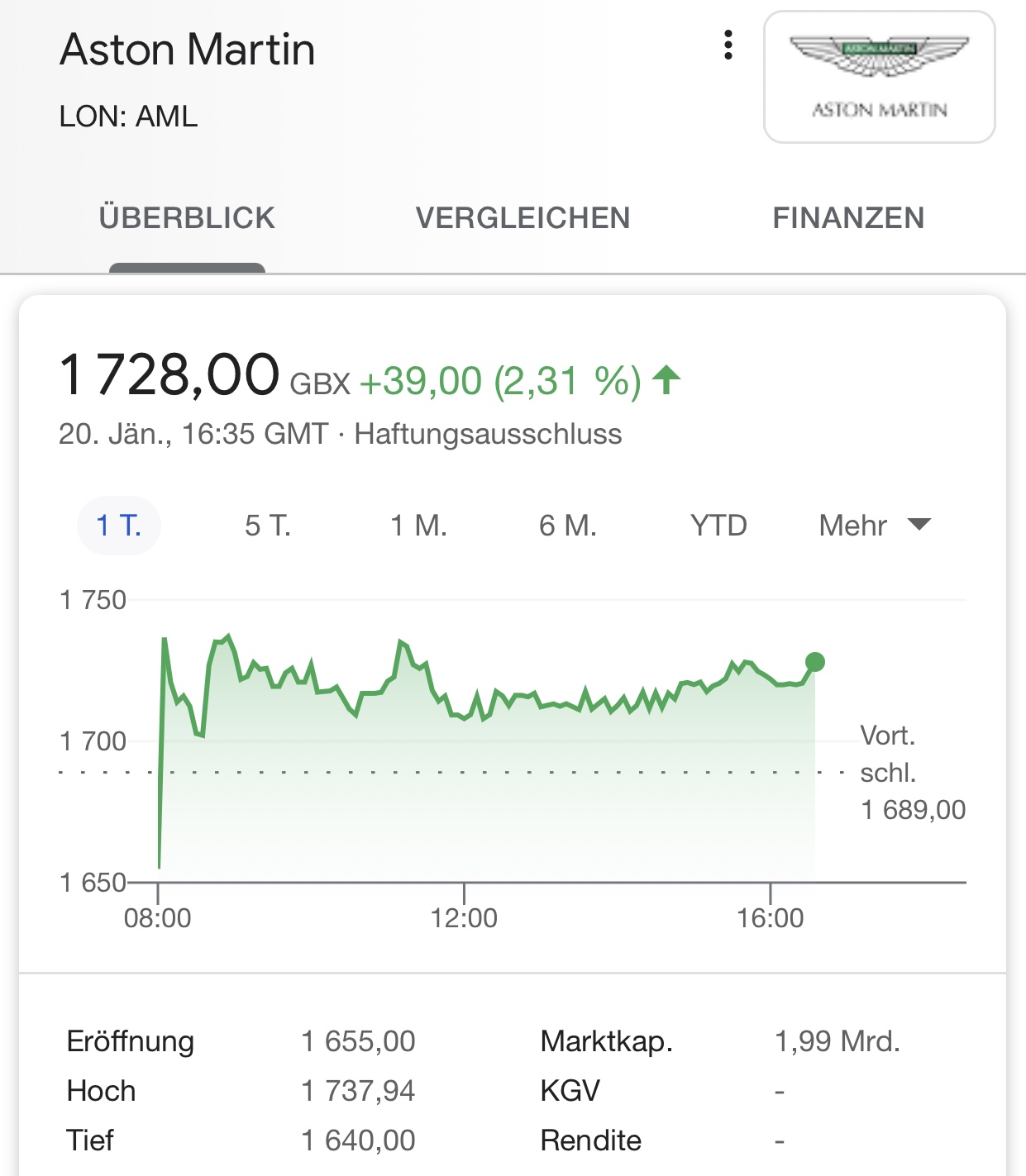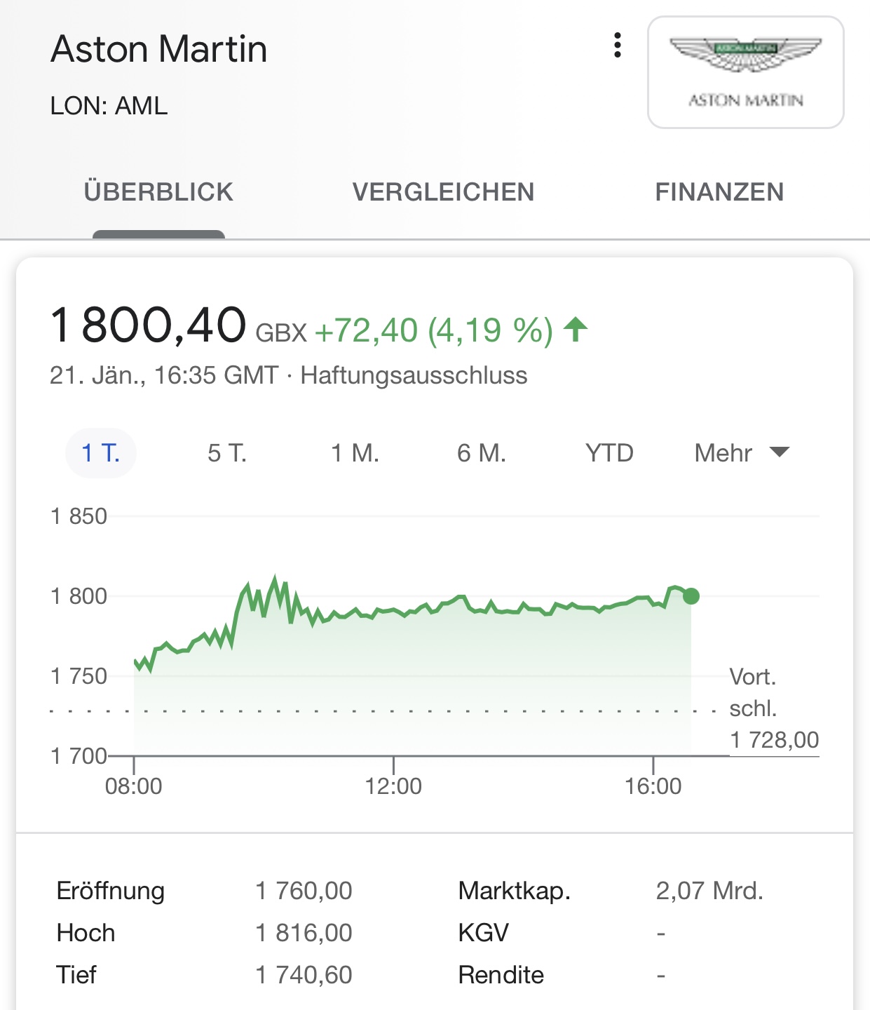 Mir wäre es am liebsten, Aston Martin würde jeden Tag konstant 0,5% zulegen. Ich brauch die Kurssprünge und Abstürze nicht. Bei 200 Börsentagen im Jahr wären 0,5% täglich eine Verdoppelung jedes Jahr. Das wär schon geil!