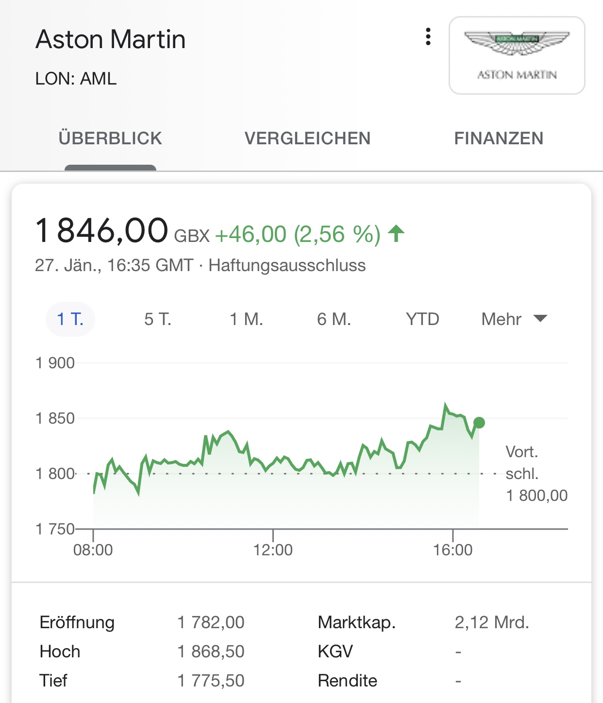 | 22 | 9.816 | Aston Martin (WKN A2QJD4) | AMLong | StevenH | 17:36 | |