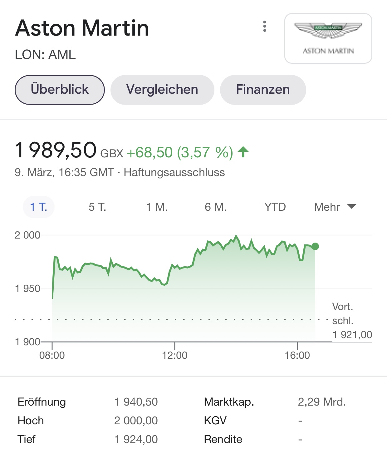 Somit glaube ich, dass es diese Woche noch ruhig bleibt und ab nächster Woche anzieht. Man will ja ev. den positiven Trend der Börse in die F1 mit nehmen. Wenn dann Aston Martin wieder in die "Öffentlichkeit" kommt und der Börsenkurs auch eine dunkelgrüne Woche hinter sich hat, dann springen vielleicht weitere Kleinanleger und Investoren auf.