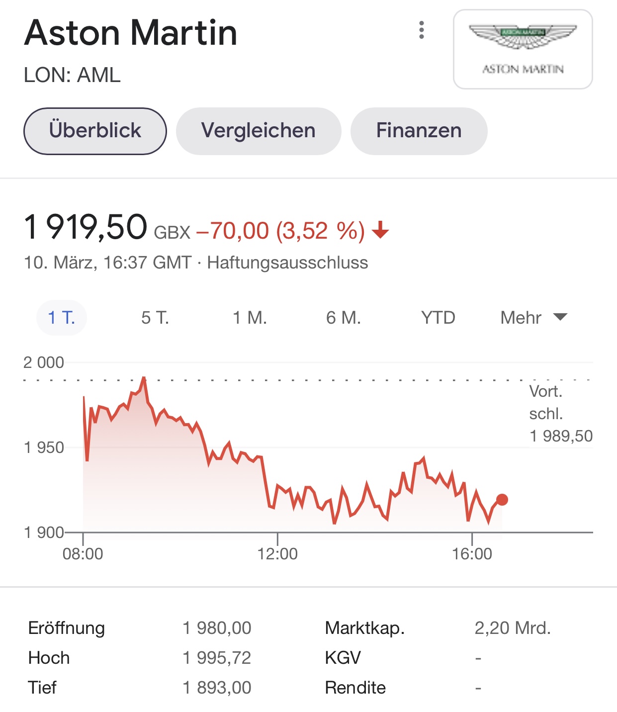 Das geht mich so an, dabei sieht ein Blinder, dass der Kurs von Aston Martin steigen möchte - so lange, bis derjenige am Vormittag wieder den Kurs drückt. Ich kann nicht verstehen, wieso man den Kurs mit Gewalt auf dem Niveau von 19 bis 20 Pfund halten möchte und nicht ein paar Wochen zuwartet und dann bei 30 Pfund seine Verkäufe durchführt, wenn man deutlich mehr Geld bekommt.