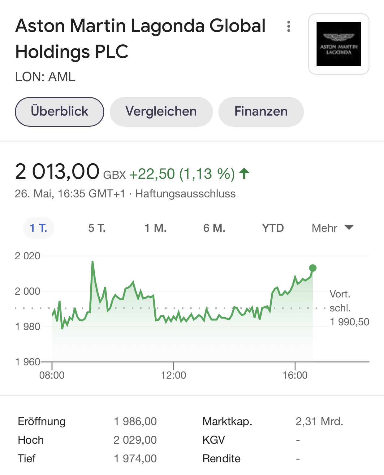 7,5 Mrd € für Lamborghini! Da müssen die tiefschwarze Zahlen schreiben, wenn so ein Preis geboten wird. AML ist aktuell nur mit ca 2,5 Mrd € bewertet. Allerdings sind die Zahlen auch tiefrot. Aber immerhin kann man schon erahnen wo es mit AML hingehen könnte, falls der Turnaround gelingt. Eine Verdreifachung des Kurses wäre doch schon mal was. ;-)