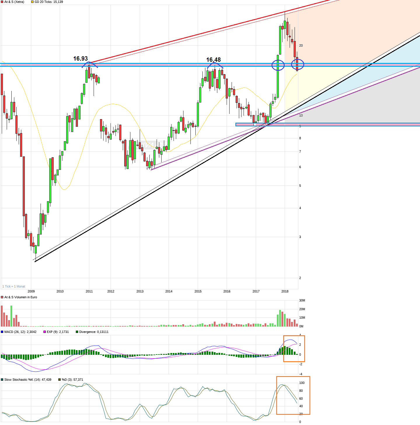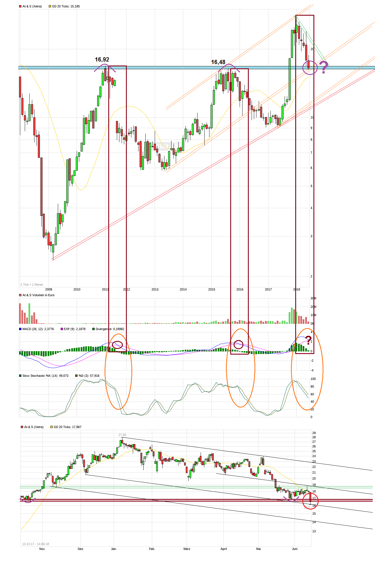 Im langfristen Monatskerzenchart wirkt die Lage nicht besonders angenehm, da hier die Stochastik bereits schon länger nach unten fallend ist und die akute Gefahr besteht, daß der MACD auch wieder nach unten kreuzt (würde wohl einhergehen mit einem nachhaltigen Fall unter die 16,50/90). Ein solche Indikatoren-Konstellation, wo auch noch der MACD nach unten kreuzt, war in der Vergangenheit mehrfach ein Zeichen für eine sich noch länger fortsetzende Konsolidierung/Korrektur. Noch ist es nicht passiert, aber die Kuh steht auf dünnem Eis. wäre gut die würde zügigst jetzt vom Eis geholt bevor Leerverkäufer den nächsten harten Wirkungstreffer zur Geltung bringen können.