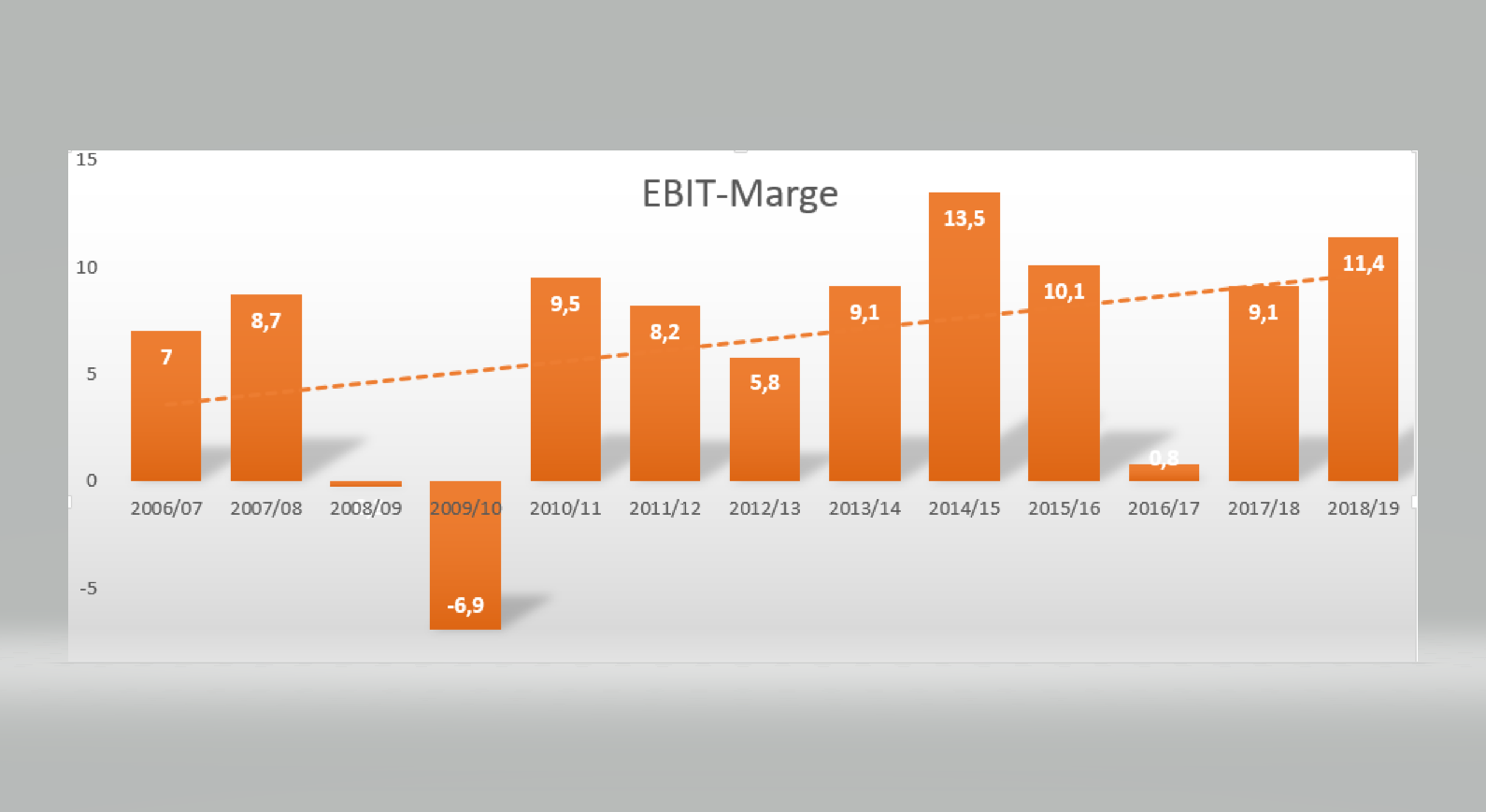 In diesen letzten 12 Jahren hat sich der Umsatz aber mehr als verdoppelt bzw. ist die EBIT-Marge deutlich angestiegen.