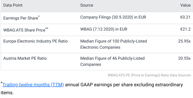 PE Ratio (KGV) der letzten 12 Monate bis 30.09. (trailing 12 months) = Share Price / EPS = 21,20 / 0,21 = 100x