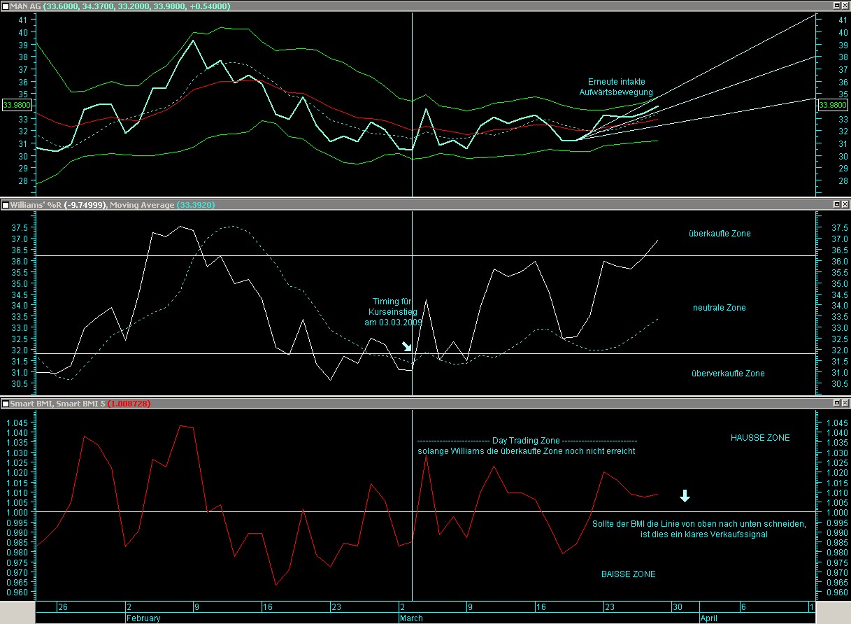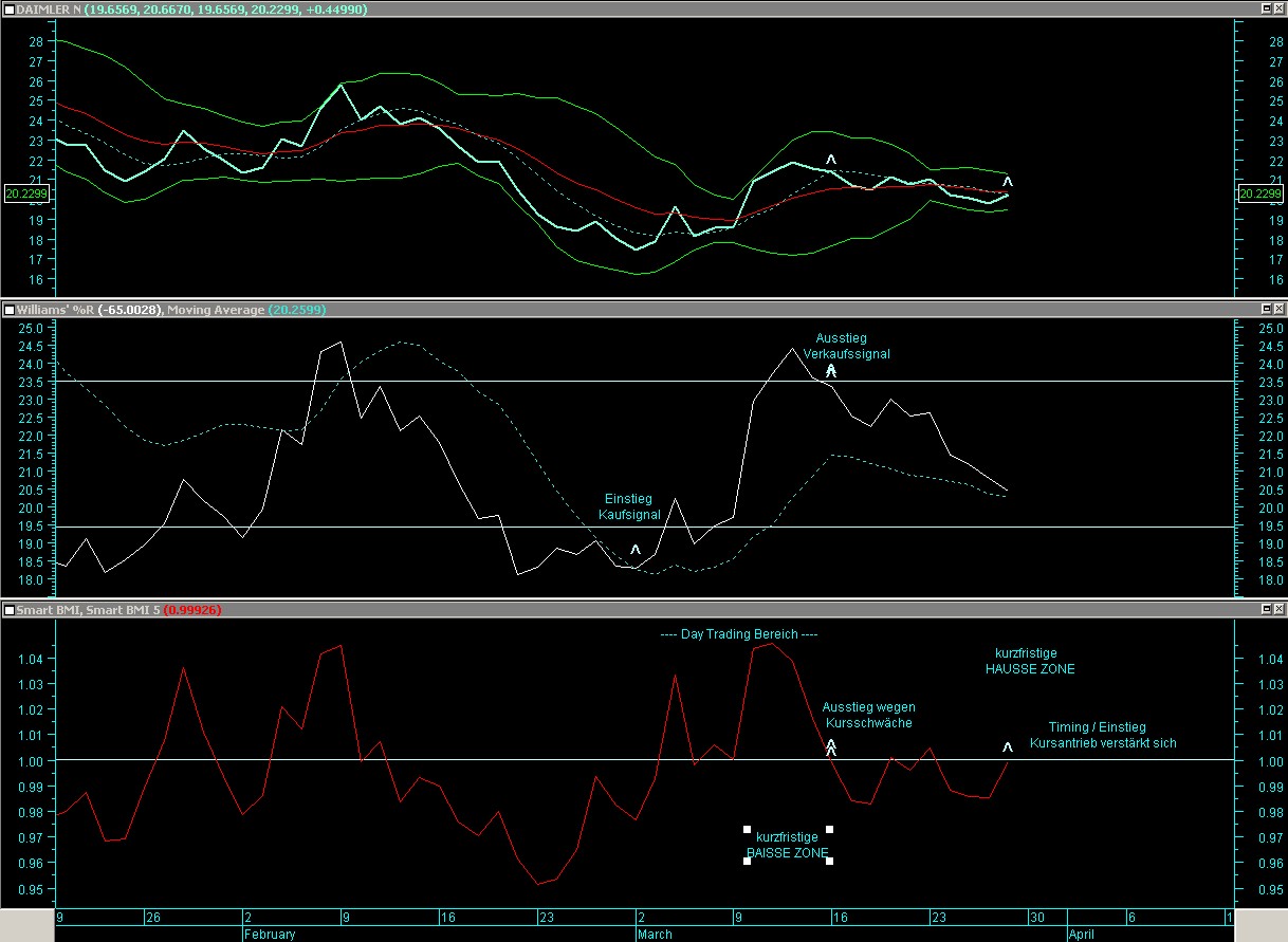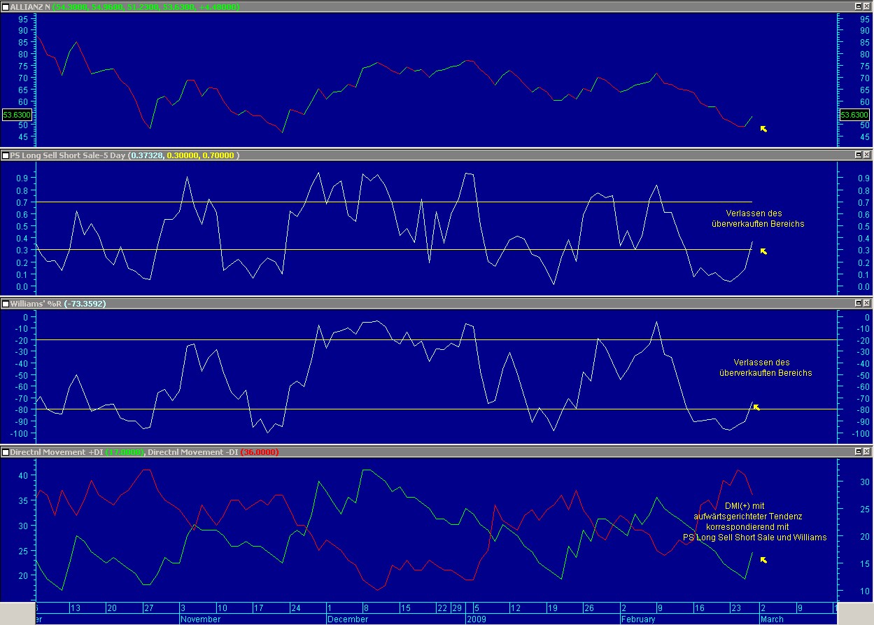 Die kräftigen Kursgewinne in dieser Woche zeigen bei einigen DAX-Titeln aber auch deutliche Hinweise auf überkaufte Situationen. Ausgerichtet an den Indikatoren PS Long Sell Short Sale und Williams liegt hinsichtlich Gewinnmitnahmen besonderes Augenmerk auf ALLIANZ, BASF, BMW, DAIMLER, DEUTSCHE BANK, DEUTSCHE POSTBANK, HENKEL, MERCK, SIEMENS.