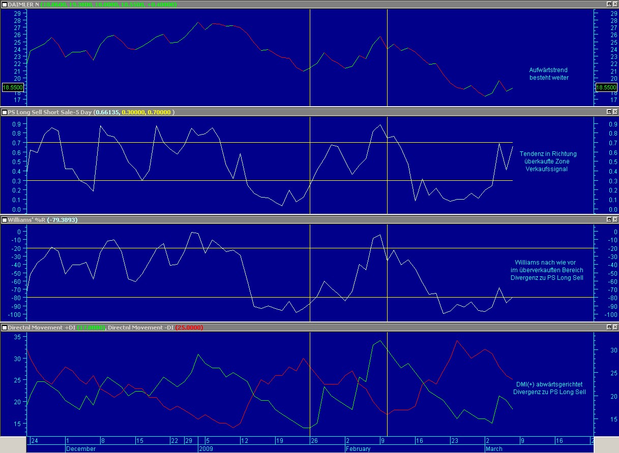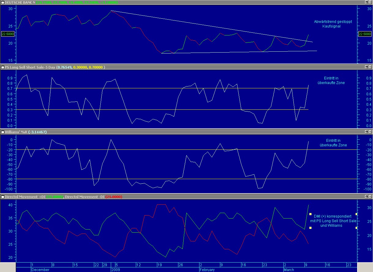 Bei den großen Indices rutscht der DOW JONES mit dem PS Long Sell Short Sale in die überkaufte Zone, wird aber noch nicht bestätigt von Williams und DMI(+) - beide noch in der Aufwärtsbewegung. Anders dagegen der DAX. Er ist beim PS bereits in der überkauften Zone, beim Williams noch im neutralen Bereich, dagegen ist der DMI(+) bereits wieder abwärtsgerichtet - Divergenzen mahnen zur Vorsicht und besonderen Beobachtung. Der Hang Seng läßt weitere Kurssteigerungen vermuten, sämtliche Indikatoren aufwärts gerichtet. Das gleiche Bild findet man auch beim Nikkei. Insgesamt deuten sich wohl Tendenzen für Kurserholungspausen und somit für Gewinnmitnahmen an.