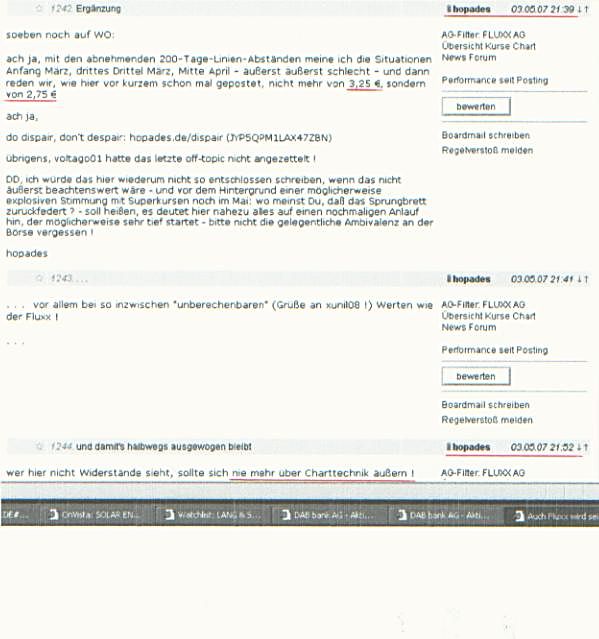 Am 03.05 07 redet er dann wieder von Kursen von 3,25 und sogar 2,75 Euro, als Begründung zieht er dann 200-Tage Linie heran von März und April (da hatte er aber aufgrund einer abflachenden 200-Linie und einem Ausbruch aus einem Wimpel noch Kurse von 5,6 Euro in einem Tageshandel in aussicht gestellt)