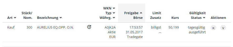 Mein letztes Posting war recht schnell geschrieben, den zu dieser Zeit gab es eine sehr gute Intraday Kaufgelegenheit für Aurelius. Ich denke der eine oder andere hat diese Kaufgelegenheit auch ergriffen. Wenn ich sowas erst poste, sobald die Kaufgelegenheit vorbei ist, ist es auch doof.
