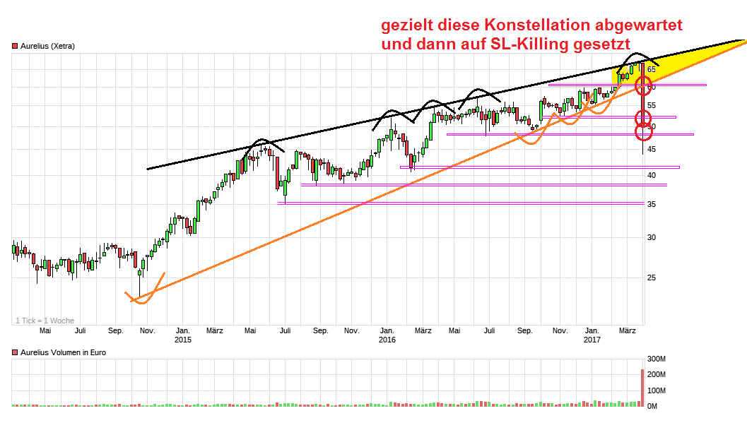 Von daher muß man nur im richtigen Augenblick die relfexhafte Panik auslösen mit derartigen Dingen, die von den Erfüllungsgehilfen der Presse zeitnah unter die Leute gebracht wird. Dann trocknet die Kaufseite in Windeseile ein und die Angebotsseite im Orderbuch schwillt an. Dann ist bei einem Wert der eh nur ein überschaubares Handelsvolumen hat und eh reif war für etwas Konso bei einem schnell hereinschwappenden Überangebot keine starke Gegenseite in dem Augenblick da, um es an wichtigen Marken/Unterstützungen frühzeitig wieder aufzufangen. Wenn man dann als attackierender LV noch in der Nähe wichtiger Breakmarken immer etwas Paketware schnell nachwirft, dann brechen eben diese Marken wo die SL liegen und diese SL verstärken dann schnell weiter den Sog nach unten, wo die nächsten SL Marken dann fallen, u.s.w.. (Domino-Effekt) bis dann die krimminellen LV/Faktenverdrehen die Gunst der Stunde nutzen die "Ernte" einzufahren/anfangen zu covern tief unten. Wie bei Wirecard oder Ströer greifen dann in der ersten Phase nach der SL-Lawinie nicht Käufer zu aus dem Lager der konservativen Longplayer, sondern mehr die übliche vagabundierende Zockertruppe, die nur auf etwas schnellen Intraday-Rebound setzt und genauso fix wieder rausgeht. Daher auch heute wieder der Rücksetzer. Die Leute die ausgestoppt wurden sind erstmal sauer und verunsichert und gehen jetzt mit verbrannten Fingern so fix nicht wieder rein und schauen erstmal, ob sich irgendwann die Sache beruhigt.