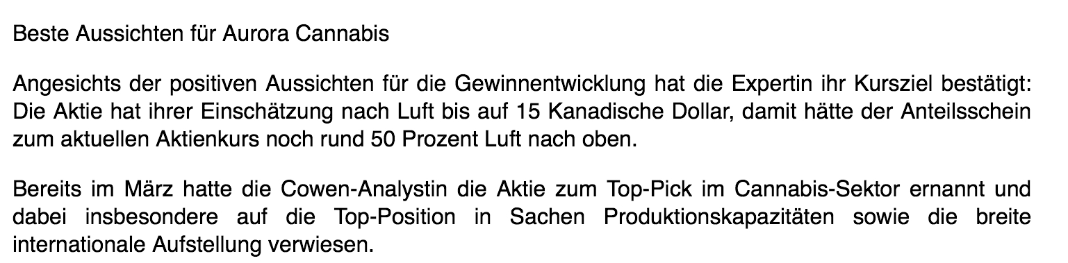 She said Aurora could add revenue via its operations in Germany and Australia, and attract a big-time strategic partner " likely brokered by strategic advisor Nelson Peltz."