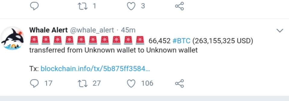 Top 20 BTC Adresse verschickt 66.233 Bitcoin (ca. 257 Mio. USD)