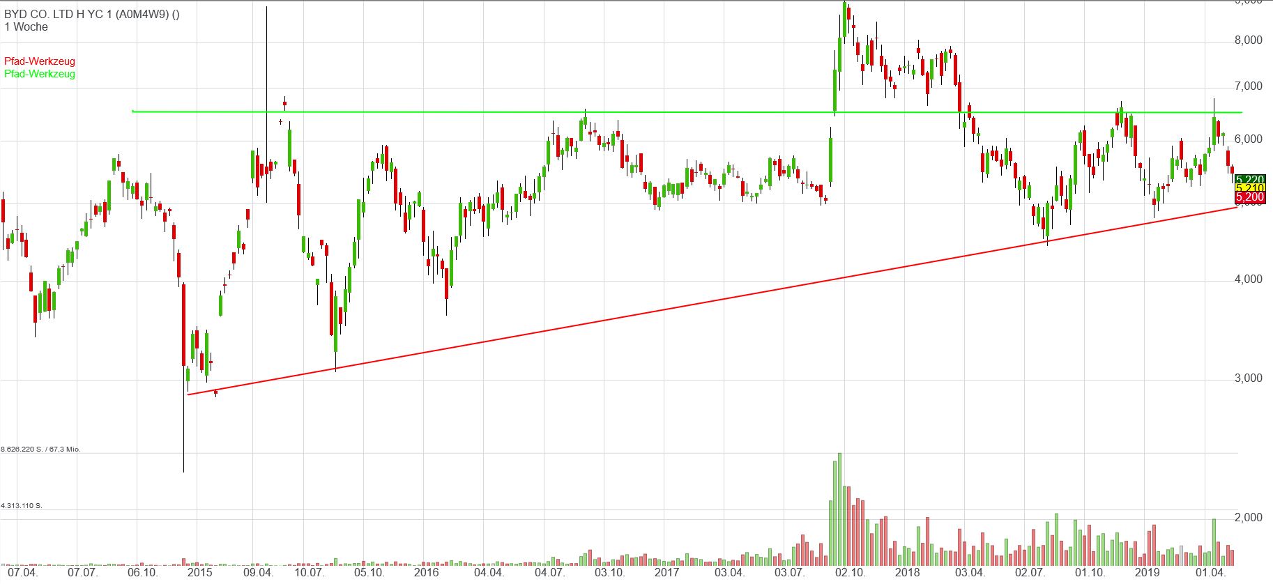 Zum besseren Verständnis meiner Interpretation noch ergänzt mit einem Chartbild (Wochenchart). Hier zeigt sich, dass das Interesse an BYD ab 2016 deutlich zunimmt und die Volatilität zwar grundsätzlich nicht abnimmt, die Schwankungbreite aber kleiner wird. Da die Höchststände seit Jahren immer mal wieder im Bereich von 6,60 enden, BYD aber seither eine Vielzahl von Erfolgen aufweisen kann, Umsatz und Gewinn nach oben zeigen, wird ein Ausbruch, wie im September 2018 immer wahrscheinlicher, wenn es gelingt diesen Widerstand für einige Tage deutlich zu überwinden. (Die Hoffnung stirbt zuletzt).