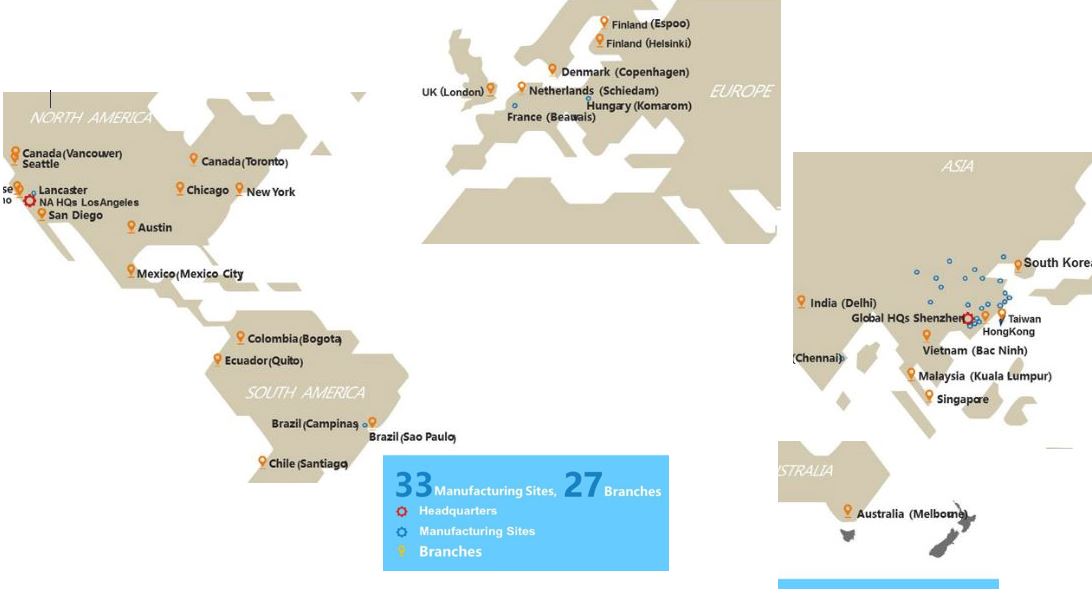 aber China allein genügt nicht. BYD will ein global-player sein, sonst würde das Netz der Niederlassungen nicht so aussehen: