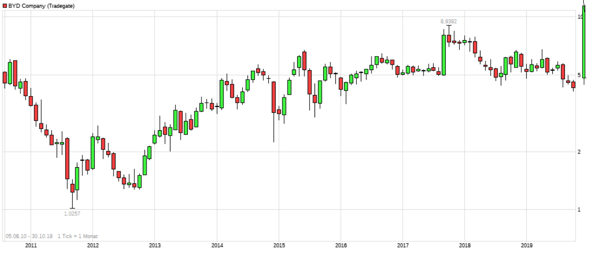 Ich habe bei BYD immer nur gekauft (auch zu Kursen bei 1,97 € -2012), und keine Stücke verkauft (auch nicht bei 9€), weil ich hier andere Ziele verfolge, Langfristige versteht sich. (habe andere Aktien mit >+1000%, die verkaufe ich auch nicht, weil die Versuchung bei 200%, 300%, 500% auch da war).