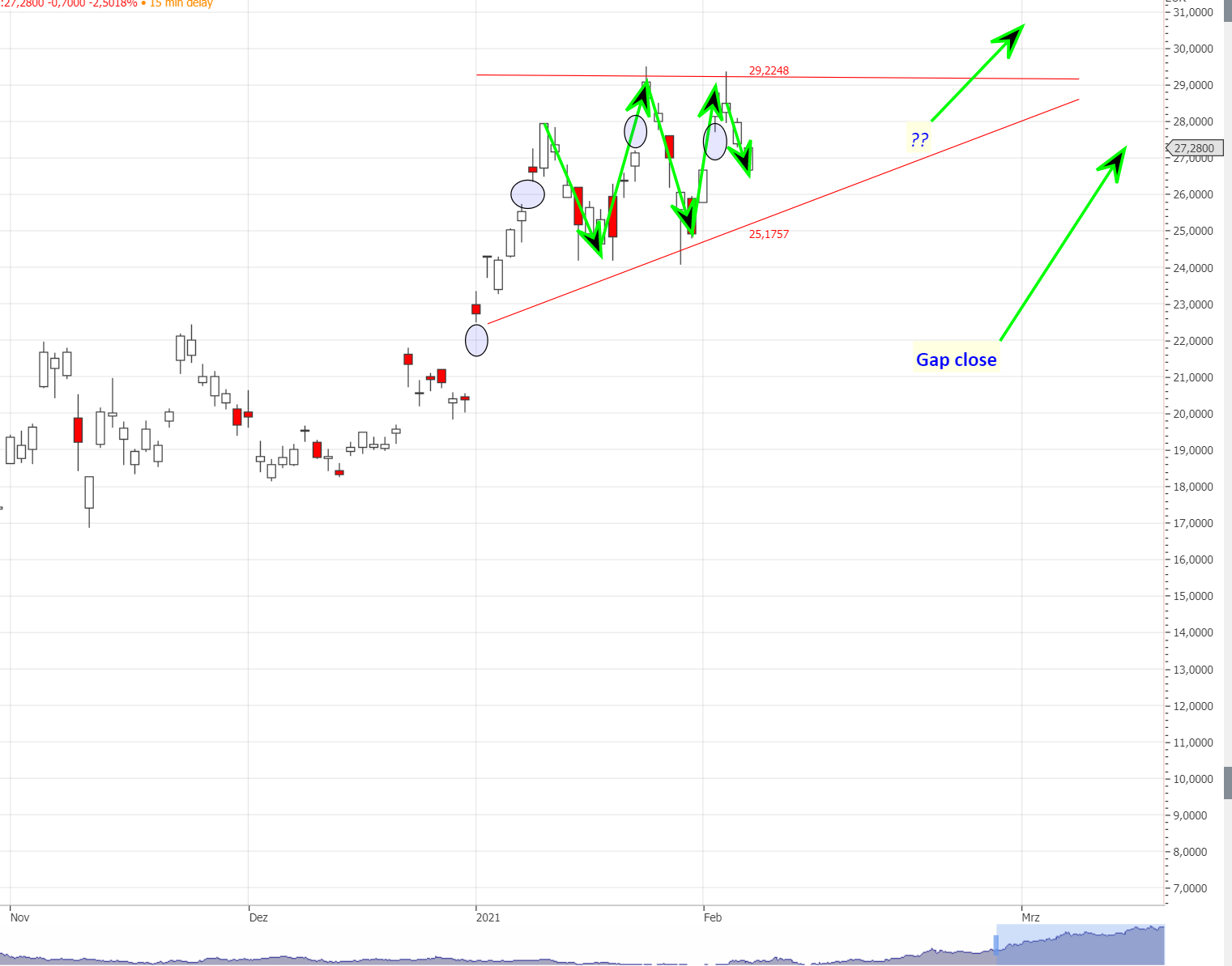 Daher sollte man darauf gefasst sein, dass der Kurs vor Ende des Keils auch nochmal auf 21.- - 22.-€ abtauchen kann, um das Gap zu schließen;
