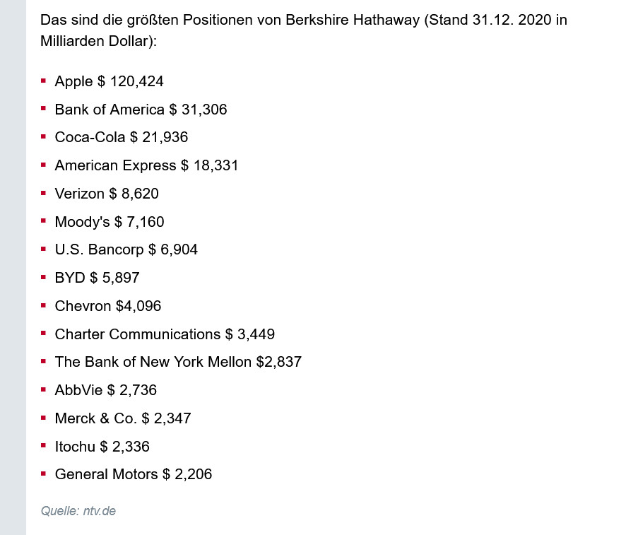 Das sind die größten Positionen von Berkshire Hathaway (Stand 31.12. 2020 in Milliarden Dollar):