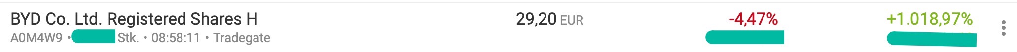 wenn Buffett für 60 Mio US$ (bei 7 Mrd. US$ Anteile!!) verkauft, so ist das mit 1% seiner Anteile Peanuts! Der alte Herr darf doch mit 92 auch mal paar Gewinne mitnehmen, warum auch immer er/sein Unternehmen das macht. Weiter, wenn Buffett bei BYD Gewitter erwarten würde, dann würde er nicht nur für 60 Mio. und 1% seiner Anteile verkaufen... Und scheibchenweise macht man es auch in größeren Tranchen. So ist eben die Börse, die einen jammern, warum auch immer, die anderen feixen sich in's Fäustchen - auch wie immer :-) Vielleicht kommen ja in den nächsten Wochen nochmals Einstiegs- oder Nachkaufkurse :-) Ich greife gerne nochmals paar Stücke ab, müßte aber noch signifikant gen Süden gehen, so gegen 20 Euro, weil darüber für mich wenig Sinn macht. Nur meine Meinung.