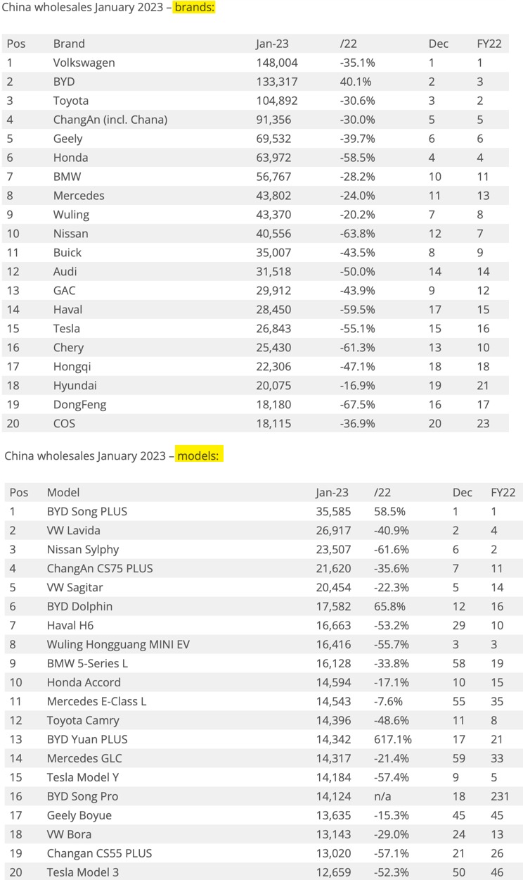 Der Monat Januar war natürlich ziemlich speziell dieses Jahr - Neujahrs-Fest, gestrichenen NEV-Subventionen, Preiskrieg von Tesla und Covidwelle. Trotzdem ist BYD noch mit 40% und Denza mit 3579% gewachsen im Gegensatz zu fast allen anderen "Brands". Bei Denza muß man allerdings dazu sagen, letztes Jahr waren da nur die mit Daimler zusammen entwickelten "Ladenhüter" die Bezugsgröße. Aktuell gibt es nur noch den neuen D9 in der Hybrid-Version.