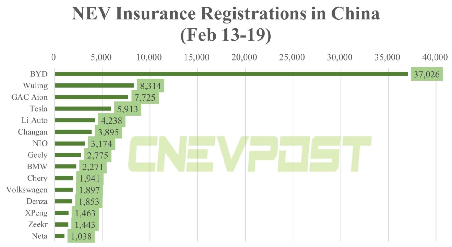 China NEV insurance registrations for week ending Feb 19: BYD 37,026, Tesla 5,913, NIO 3,174