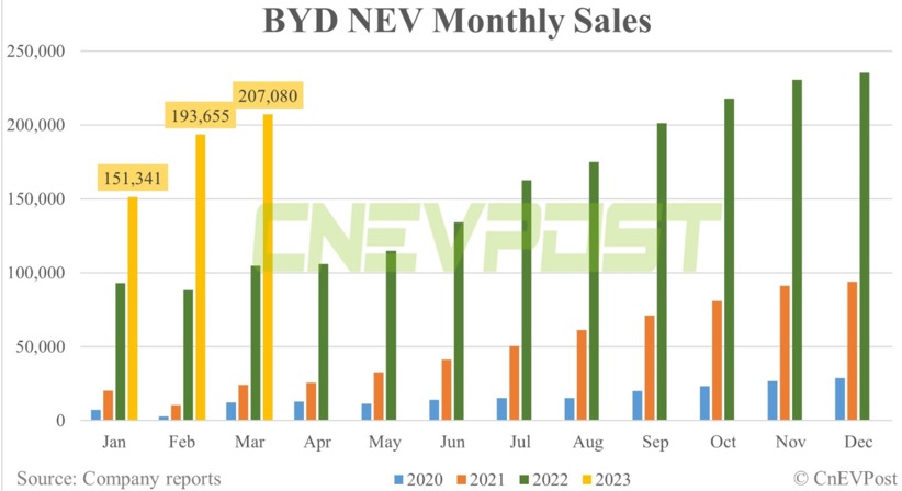 BYD sells 207,080 NEVs in Mar, up 6.9% from Feb