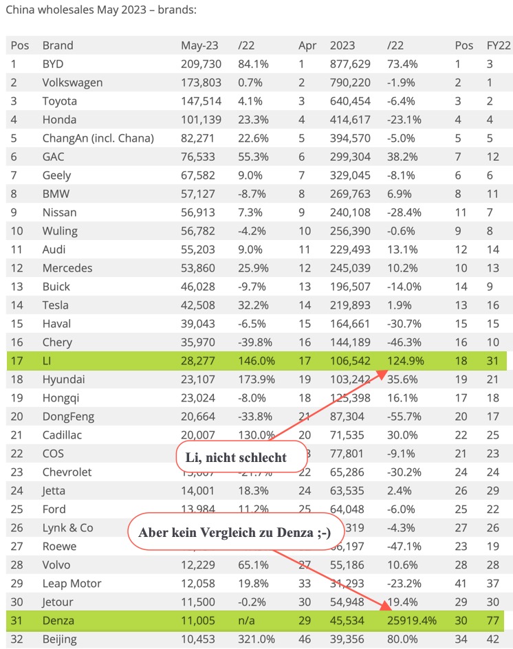 Aus Frust über diese Entwicklung hat man in China Tesla die Tür sperrangelweit aufgemacht (trotz Musks Frechheiten gegenüber BYD in 2012). Jetzt hat man in China immerhin einen potenten westlichen EV-Konzern, der den eigenen EV-Unternehmen ordentlich Dampf macht.