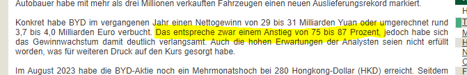 Die Chinesen haben aber ihre Geschäftszahlen 2023 an der Börse Hongkong „vorläufig“ per Mitteilung veröffentlicht. Darauf reagieren zumindest einige Kommentare. Die Kommentare erachte ich als nicht bedeutend. Sie zielen darauf ab, dass BYD die Erwartungen enttäuscht habe. Das ist so nicht richtig.
