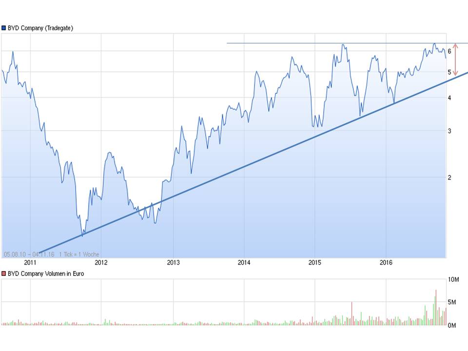 Der Kurs der Aktie von BYD.co befindet sich seit 2011 bereits in einem sehr volatilen Aufwärtstrend. Die Trendlinie wurde in dieser Zeit allerdings kein einziges Mal verletzt. Aktuell schwächelt der Kurs und lässt auf weitere Schwäche schließen. Das wäre allerdings nicht fatal, sondern könnte möglicherweise als Chance begriffen werden, sofern die Trendlinie ein erneutes Mal halten sollte. Ab dem aktuellen Niveau, müsste die Aktie allerdings zunächst um 30 % fallen, um die Trendlinie zu erreichen.