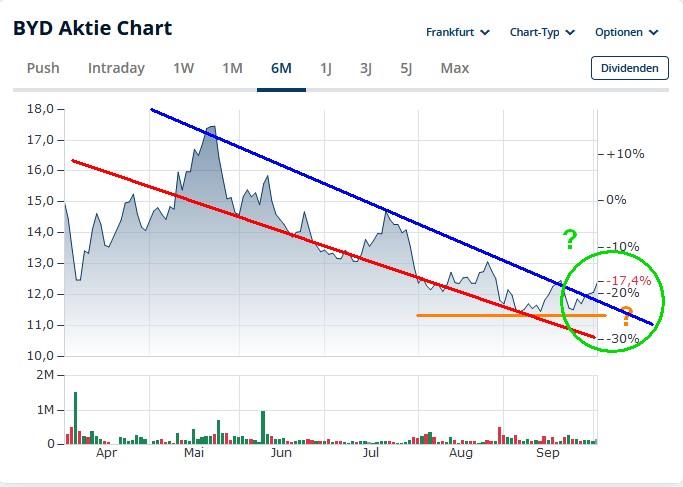 Ist das "heute" der "endgültige" Ausbruch aus dem Abwärtstrend der letzten Monate, oder ist es nur ein kleiner Zacken und die Linien dienen nur der Verwirrung und es geht noch gen 11,11€ nach diesem Aufwärtszacken? (Quelle www.finanzen.net/aktien/byd-aktie )
