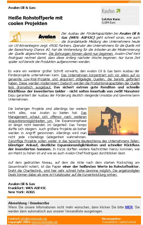 Avalon Oil & Gas, Inc. is an oil and gas company engaged in the acquisition of oil and gas producing properties with multiple enhancement opportunities.