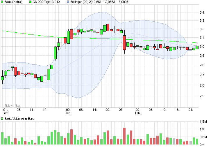 Habe meine Tradinggewinne von LuS heute in Balda investiert, da hier vermutlich ein Ausbruch kurz bevor steht. Die Bollinger haben sich extrem verengt, was einen Ausbruch vermuten lässt. Heute hat der Kurs schon einemal kurz übers obere Bollinger geguckt.