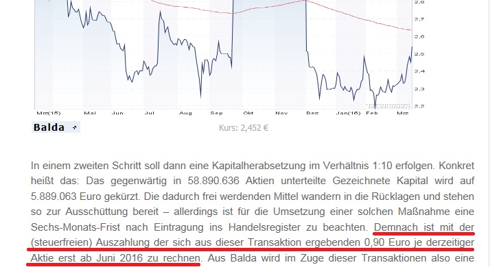 HRB 3077: Balda Aktiengesellschaft, Bad Oeynhausen, Bergkirchener Str. 228, 32549 Bad Oeynhausen. Die Hauptversammlung vom 29.01.2016 hat die Herabsetzung des Grundkapitals durch Einziehung von Aktien um 6,00 EUR beschlossen. Die Gesellschaft hat Gläubigern, deren Forderungen vor dieser Bekanntmachung begründet worden sind, Sicherheit zu leisten, soweit sie nicht Befriedigung verlangen können, wenn sie sich binnen sechs Monaten zu diesem Zweck melden.