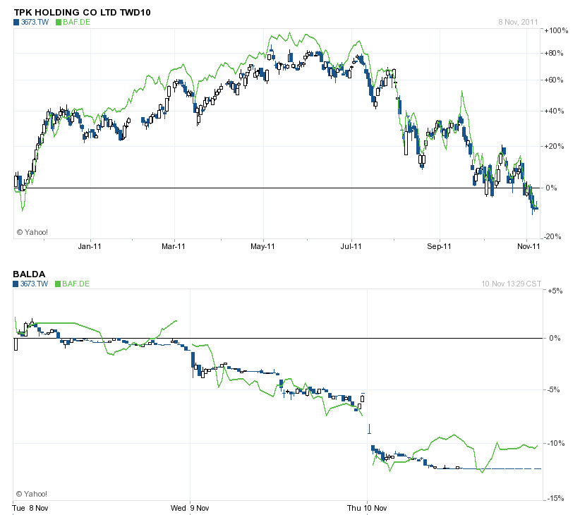 Was bei TPK fundamental realistisch ist, weiß ich nicht. Umsp mehr orientiere ich mich am Chart, der bei TPK eher wenig aussagt, außer das es keine Unterstützungen mehr gibt (aufgrund der geringen Historie). Daher kann man Balda gensondert betrachten und da schließe ich 3,1 € nicht aus, vor allem auch da das sonstige Geschäft Verluste macht und eigentlich mit Null bewertet werden kann. Kurzfristig würd mich allerdings eine Gegenbewegung auf 4,4-4,5 € bzw. 460 TWD nicht wundern. Sind ja ziemlich überverkauft die beiden Aktien.