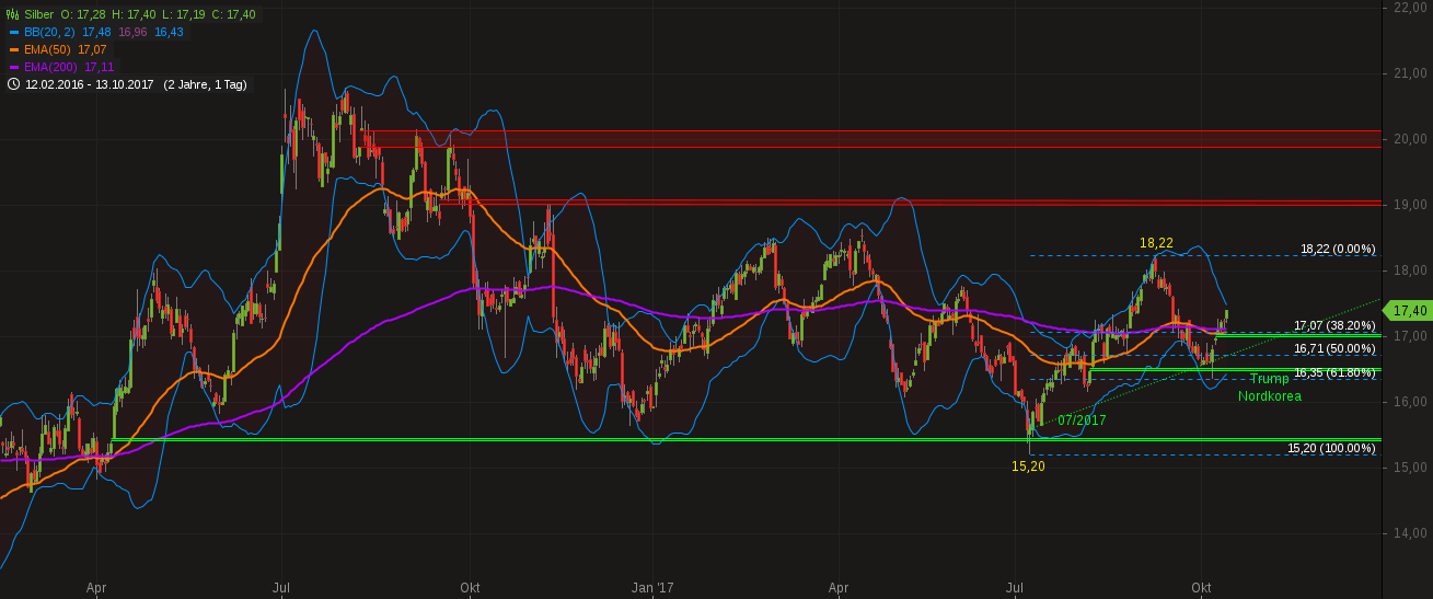 Alle 3 zogen diese Woche einen Graben nach Süden, der sie vor dummen Gedanken abhalten sollte. Aber der Zug nach Norden fehlt noch (sieht man einmal von der solitären Freitagskerze ab)kß´+; es ist das mehr ein Trippeln und Abtasten. Die vorangegangenen 62-%igen Korrekturen der jeweiligen Aufwärtsbewegungen hatten ja bereits angedeutet, dass die Trendbewegungen Richtung Norden derzeit eher gemässigter Natur sind. Freitag schickten die Edelmetalle dann ihre Wochenschlusskerze auf Erkundungstour in nördlichere Regionen. Was sie dabei entdecken konnten, werden uns die Kerzen in der folgenden Woche berichten können.