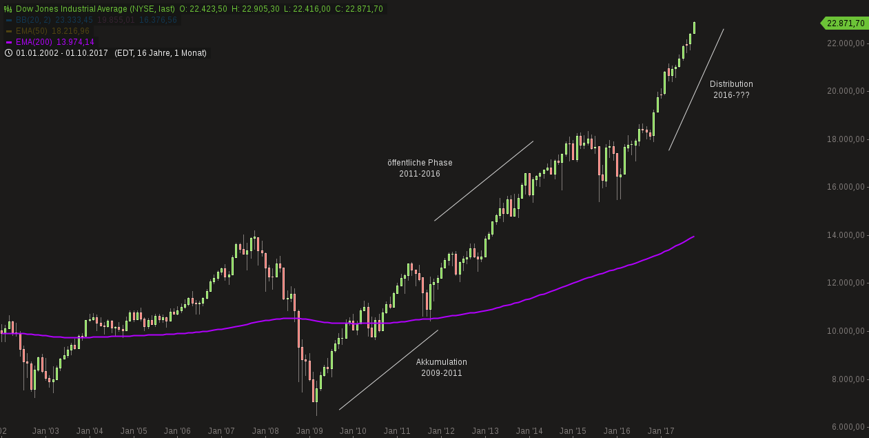 Der HUI surft seit Anfang Juli im Wochenchart auf der 01/2016-Aufwärtstrendlinie entlang und wird dabei von beiden EMAs nach oben in Schach gehalten. Positiv in diesem Chartbild ist der Verlauf der EMA 200: nachdem sie jahrelang steil bergab verlief, hat sie sich nun seit Anfang 2016 horizontalisiert, und damit sollte sie den Grossinvestis bzw. Algo-Programmierern ein wenig auf die Sprünge helfen können. Die US-Indizes tragen ihren Teil dazu bereits bei: sie sind schon seit längerem in der Distributionsphase und bringen sich somit für eine Schützenhilfe schon einmal in Stellung.
