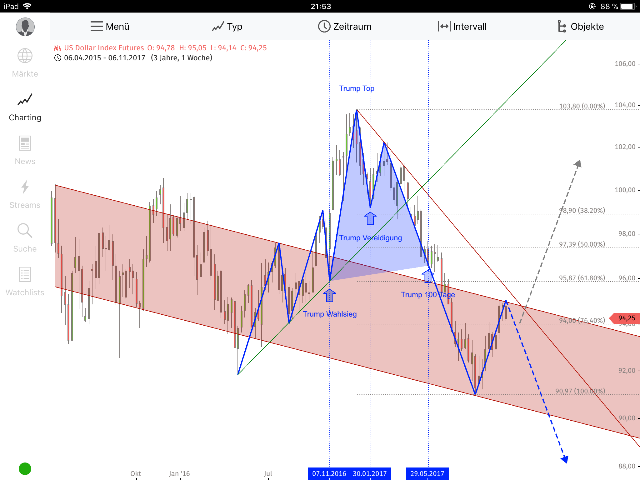 In Lauerstellung nahe dem Triggerpunkt der W-Formation (USD 17,47) errichtete Silber am Montag mit einer "belt-hold"-Kerze einen Aussenstab, dem unmittelbar darauf eine Reihe von bislang 4 Innenstäben folgte, die mit ihren Spannweiten die beiden eng aneinander liegenden EMA 50 sowie EMA 200 (seit ca. 1 Monat in harmonischer Synchronizität nebeneinander herlaufend) umtanzten.
