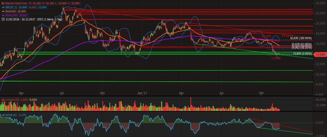 Die Edelmetalle und der HUI sind in Kämpferlaune; Barrick wird wie an einer Leine hinterhergezogen und fällt damit zumindest vorerst noch nicht tiefer. Eine Chance für Barrick, hier einen Boden einzuziehen.