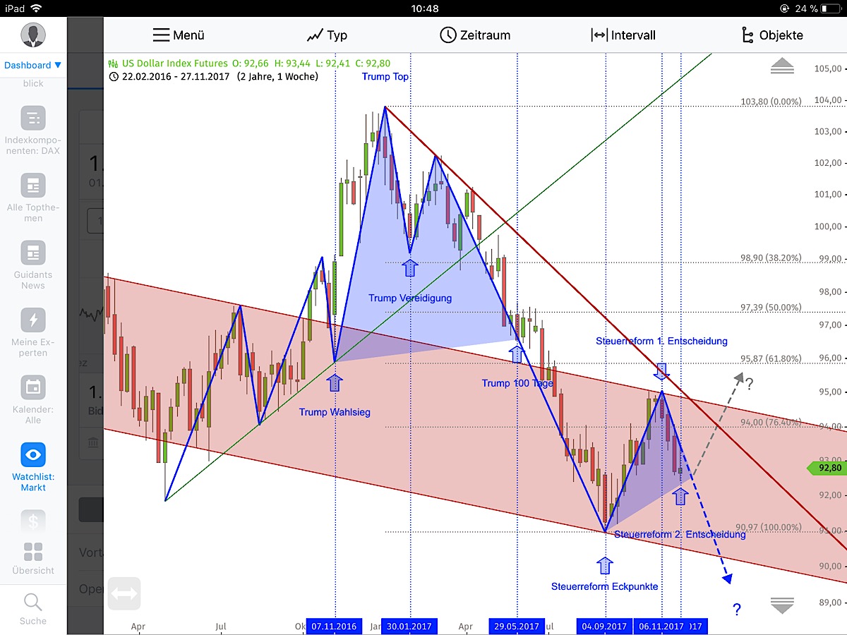 Wird wohl in den nächsten Tagen spannend zu sehen sein, ob wir nach den Trump Top im US Dollar nur eine Korrektur gesehen haben oder ob gerade die 5. Welle der Abwertung läuft