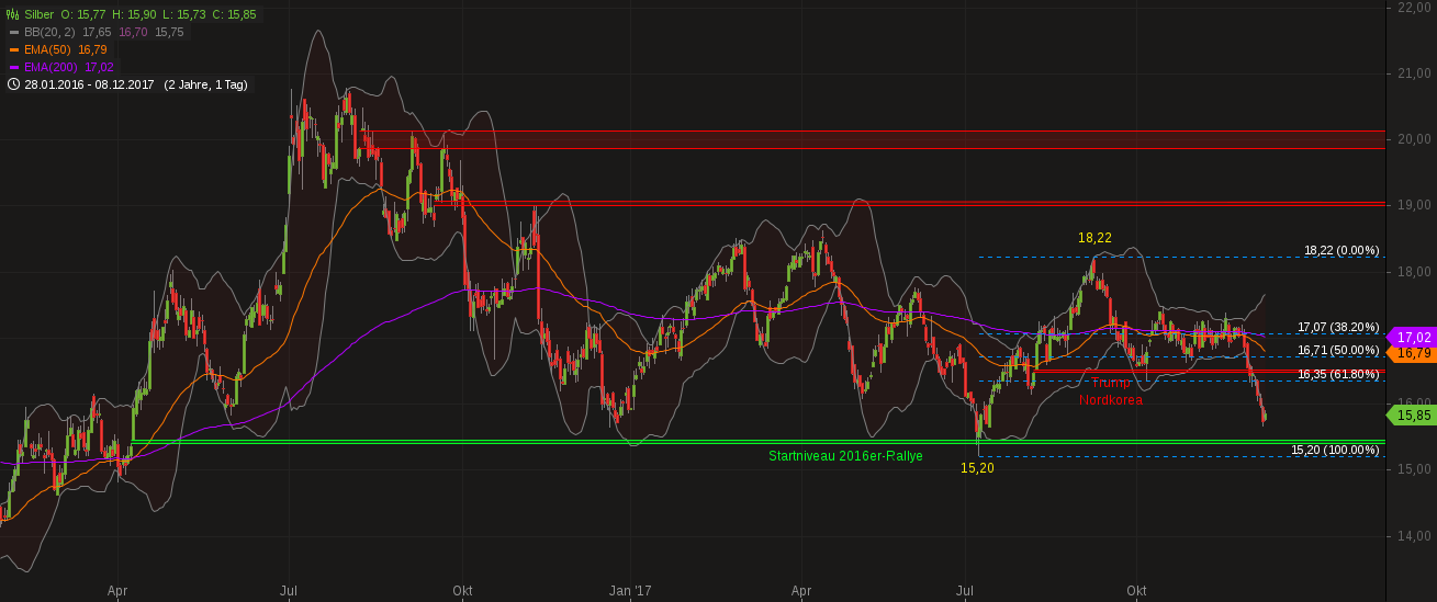 Silber konnte es diese Woche gar nicht schnell genug gehen, um das Startniveau der 2016er-Rallye zu erreichen. Das BB konnte ihm dabei nur noch hinterherschauen … Auf USD 15,4 (Startniveau 2016er-Rallye) steht eine Wand, die sich seit 20 Monaten dem Edelmetall als Unterstützung anbietet. Silber war erst ein einziges Mal auf dieses Angebot angewiesen und nahm es im Juli dieses Jahres auch dankbar an. Das Edelmetall bewegte sich damals richtiggehend mit Karacho darauf zu, mit dem Ansinnen diese Mauer zu brechen, federte aber nach dem Anprall mit der durch den Aufprall freiwerdenden Energie schnurstracks Richtung Norden und erzeugte in der Folge ein Kursplus von knapp 20 % in 2 Monaten. Noch hat Silber dieses Niveau nicht erreicht, es gab kurz vor Anlauf dieses Kurswertes zum Wochenausklang ein bullish-harami, also ein Umkehrsignal, auf Tagesebene, ganz analog zu jenem der Vorwoche. Damals wurde dasselbe jedoch montags nicht bestätigt und führte eben zum dieswöchigen Abverkauf. Für einen erfolgreichen Umkehrversuch kommenden Montag braucht es daher einen Tagesschlusskurs von mindestens USD 15,86. Markttechnisches Resultat des dieswöchigen Abverkaufs ist ein neu generierter Abwärtstrend der aktuellen Korrekturbewegung. Werden USD 15,2 unterschritten, dann wird dieser Abwärtstrend zu einem solchen auf Tagesebene befördert, was dem weiteren Kursverlauf nicht sehr gut bekommen würde.