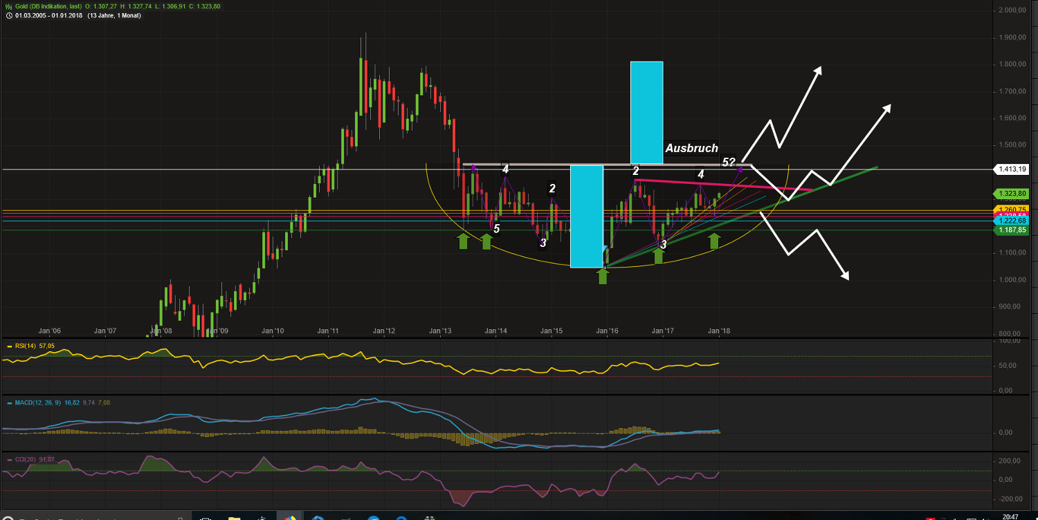 Noch ist jedoch nichts entschieden, ein längeres Verharren über 1300$ wäre im Seitwärtslaufen auch akzeptabel.
